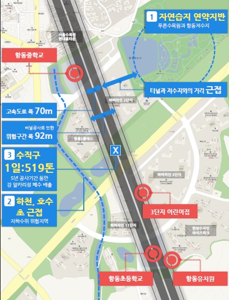 “신도시라고 한푼 두푼 모아서 어렵게 내 집을 마련했는데, 내 아이가 다닐 초등학교 밑으로 고속도로가 지나간다니요. 여기가 강남이었으면 이렇게 했겠습니까. 최신식 공법이면 뭐합니까. 항동지구 입주자들은 언젠가는 무너질 시한폭탄을 안고 살게 되는 겁니다.”(구로 항동지구 입주 예정자)국토교통부가 서울 구로구 항동지구의 아파트 단지 밑을 관통하는 지하 고속도로를 추진하고 있어 논란이다. 입주 예정주민들은 위험성이 있으니 노선을 변경해달라며 반발하고 있다. 국토부는 안전평가가 이미 끝났기 때문에 문제가 없다는 입장이다.문제의 사업은 지난 2월 20일 국토부가 승인한 ‘광명~서울 민자고속도로(서서울고속도로)’ 건설계획이다. 경기도 광명시 가학동(가학IC)과 서울시 강서구 방화동(방화IC)을 연결하는 프로젝트다.◆서서울고속도로 가학IC-방화IC 구간, 구로 항동지구 지하통과국토교통부는 경기도 광명시 가학동(가학IC)과 서울시 강서구 방화동(방화IC)을 연결하는 길이 20.2km, 왕복 6차선 지하 민간고속도로 건설을 계획 중이다. 올해 말 착공에 들어가 5년 후 완공 될 예정이다. 사업 시행사는 ㈜서서울고속도로로 코오롱글로벌이 주관하며 국민연금(20%) 등 연기금과 보험사, 건설사 등 19개 기관이 출연했다.문제는 이 고속도로가 구로 항동지구 아파트 단지 밑을 통과한다는 점이다. 구로구에 따르면 구로 항동지구에는 총면적 66만2525㎡ 부지에 5200세대의 아파트가 주민입주를 앞두고 있다. 이곳에 조성되는 항동초등학교와 일부 아파트 단지 지하 약 30미터에 고속도로가 관통하게 돼 있다.입주 예정주민들은 국토부가 분양 공고 전에 이 같은 사실을 제대로 알리지 않았다고 지적한다. 실제 항동지구 개발계획은 2015년 발표됐지만 서서울고속도로와 관련한 주민 공청회는 이미 2014년에 진행됐다.주민들은 항동지구에 실제 입주하는 주민들의 의견 수렴이 없었던 사업계획은 재검토해야 한다고 주장하고 있다. 최재희 구로 항동지구 현안 대책위원장은 “국토부는 항동지구에 살게 될 입주주민들과는 공청회조차 진행하지 않았다”며 “세부건축계획 수립 이전에 실시된 환경영향평가는 무효이며 즉각 재시행 해야한다”고 지적했다.◆전문가 “항동지구 지반 약해...위험하다”국토부는 이미 2014년에 한국터널지하공간학회 등에 용역을 맡겨 안전진단을 실시했으며 문제점이 발견되지 않았다는 입장이다. 주민 민원에 따른 추가 협의 계획에 대해서는 아직 얘기할 수 없다고 밝혔다.국토부 관계자는 “서서울고속도로 지하 통과에 대한 항동지구 주민들의 우려가 있고 국토부에서도 우려에 대한 대책을 세우고 있는 상황”이라면서도 “해당 사업은 민간 시행사가 협의서를 작성하고 기준에 따라서 하는 것인 데다 아직 주민들에게 전달이 안된 부분도 있기 때문에 구체적으로 얘기할 수는 없다”고 말했다.전문가들은 국토부의 환경영향평가에 문제가 있었다고 지적하고 있다. 국가지하수정보센터에 따르면 항동지구 인근의 지하수 함양률(강수가 지하수로 유입되는 비율)은 0.47%로 서울시 평균치 10% 내외에 크게 못 미치는 수준이다. 그러나 국토부는 이전 환경영향평가에서 항동지구의 함양률을 10%로 두고 평가를 진행했다.이찬우 한국터널환경학회 부회장은 “10%의 함양률을 가지고 계산했기 때문에 서서울고속도로 건설로 유출되는 지하수보다 비가 와서 채워지는 양이 더 많다는 결론이 나온 것”이라며 “함양률이 낮은 항동지구의 토질을 고려하면 폭우 등 재난이 겹치게 될 경우 분명히 위험성이 있을 것으로 본다”고 설명했다.◆“싱크홀 발생해도 책임 규명 어려워... 피해는 주민들 몫”싱크홀의 위험성에 대한 사회적 인식이 개선돼야 한다는 목소리도 나온다. 최근 서울 도심에서 지반침하가 연이어 발생하고 있음에도 예방을 위한 관리 체계가 이뤄지지 않고 있다는 것이다. 지난 8월 서울 금천구의 한 아파트 인근에서도 대형 싱크홀이 발생해 주민이 대피하는 등 소동이 일어난 바 있다.이 부회장은 “건물이 무너지는 경우 시공사에게 책임을 물으면 되겠지만 땅이 무너지면 인과관계를 명확히 규명하기 어려운 부분이 있다”며 “이 때문에 정부나 시공사측에서도 신경을 잘 안쓰고 있는데 그 피해는 오롯이 주민들에게 돌아갈 수 밖에 없다”고 지적했다.건설업계 관계자는 “일정 규모 이상의 지하공사에 대해서는 지하 안전영향평가 및 사후 지하 안전영향조사를 실시하도록 하는 등 지하 안전관리제도를 시행해야 한다”고 말했다.