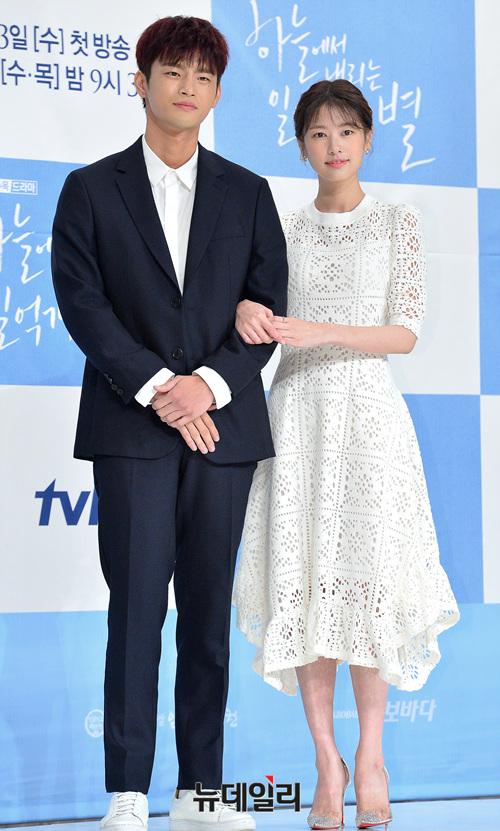 배우 서인국과 정소민이 28일 오후 서울 영등포구 타임스퀘어에서 열린 드라마 '하늘에서 내리는 일억개의 별' 제작발표회에 참석해 포즈를 취하고 있다.