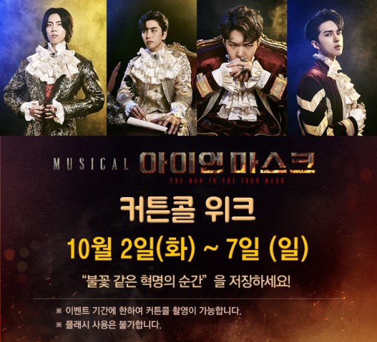 '아이언 마스크' 측은 관객의 뜨거운 성원에 보답하기 위해 10월 1일부터 7일까지의 공연에 한해 커튼콜을 자유롭게 촬영할 수 있는 '커튼콜 위크'를 진행한다.