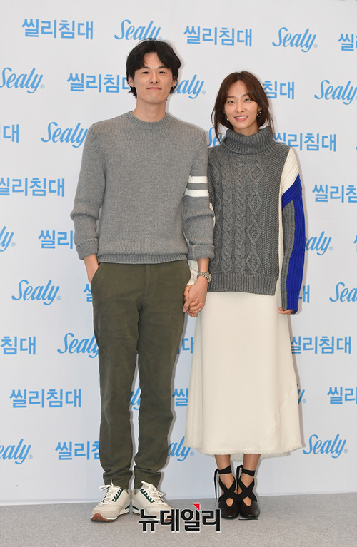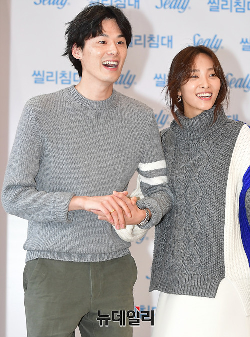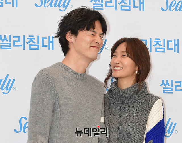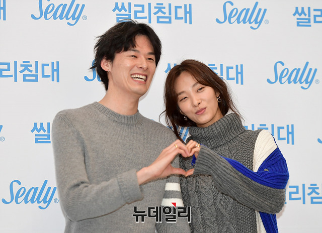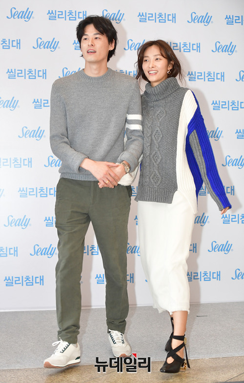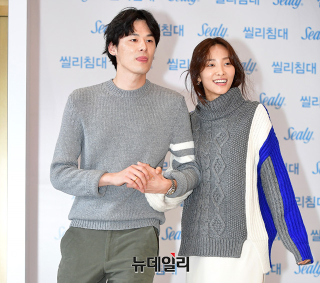 모델 김원중, 곽지영 부부가 1일 오후 서울 중구 롯데백화점 본점에서 열린 씰리침대 137번째 생일 및 신제품 출시행사에 참석해 포토타임을 갖고 있다.