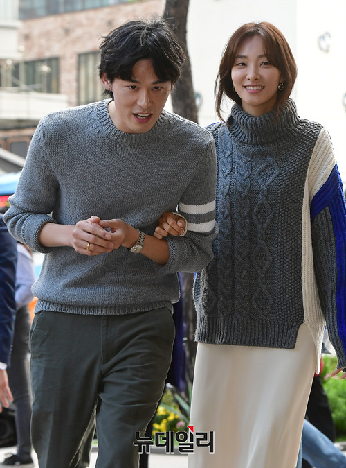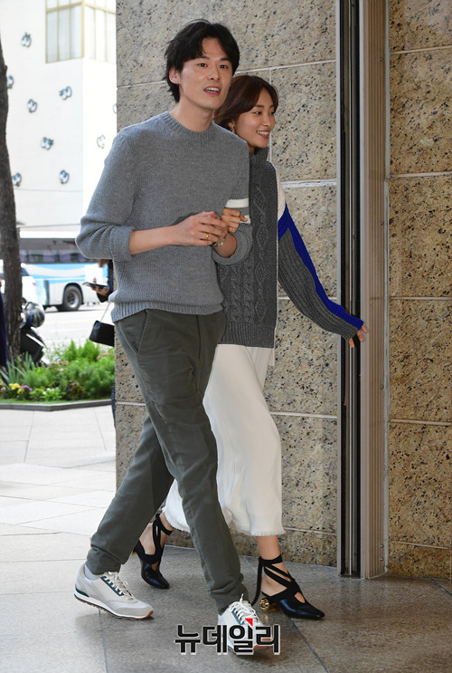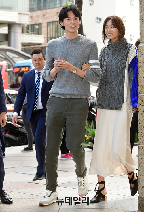 모델 김원중, 곽지영 부부가 1일 오후 서울 중구 롯데백화점 본점에서 열린 씰리침대 137번째 생일 및 신제품 출시행사에 입장하고 있다.
