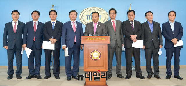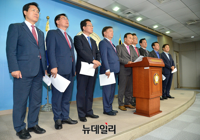 자유한국당 소속 국회 국토교통위원회 위원들이 1일 오후 국회 정론관에서 더불어민주당의 증인 채택 거부를 규탄하는 기자회견을 하고 있다.