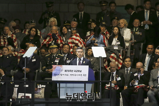 정경두 국방부 장관이 1일 오후 서울 용산구 전쟁기념관에서 열린 제70주년 국군의 날 기념식에서 환영사를 하고 있다. (사진=공동취재단)