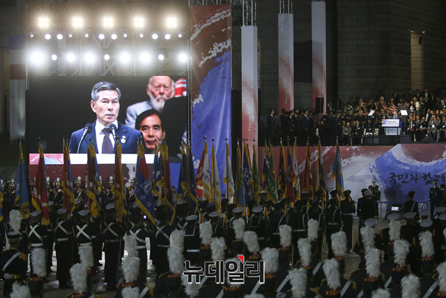 [포토] 제70주년 국국의날 기념식 환영사 하는 정경두 국방부 장관