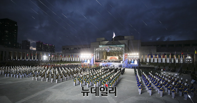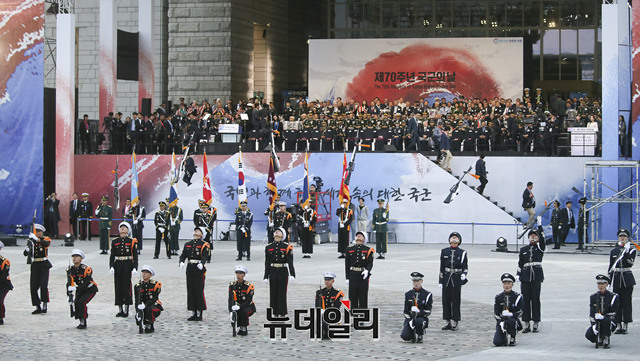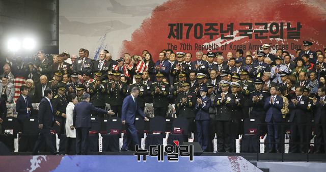 문재인 대통령과 김정숙 여사를 비롯한 관계자들이 1일 오후 서울 용산구 전쟁기념관에서 열린 제70주년 국군의 날 기념식에서 국민의례를 하고 있다. (사진=공동취재단)