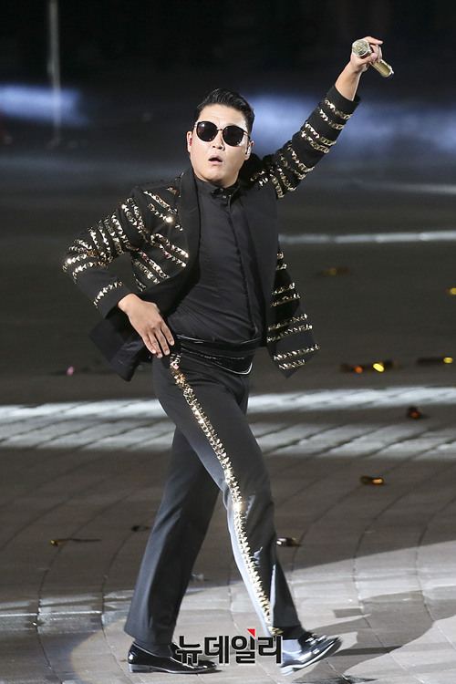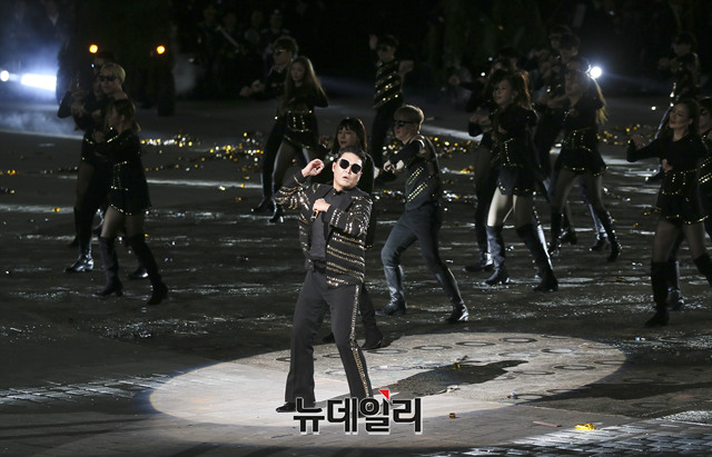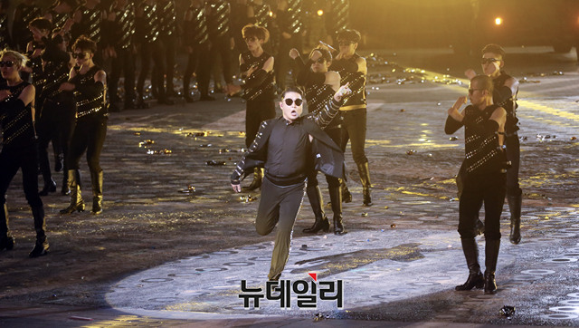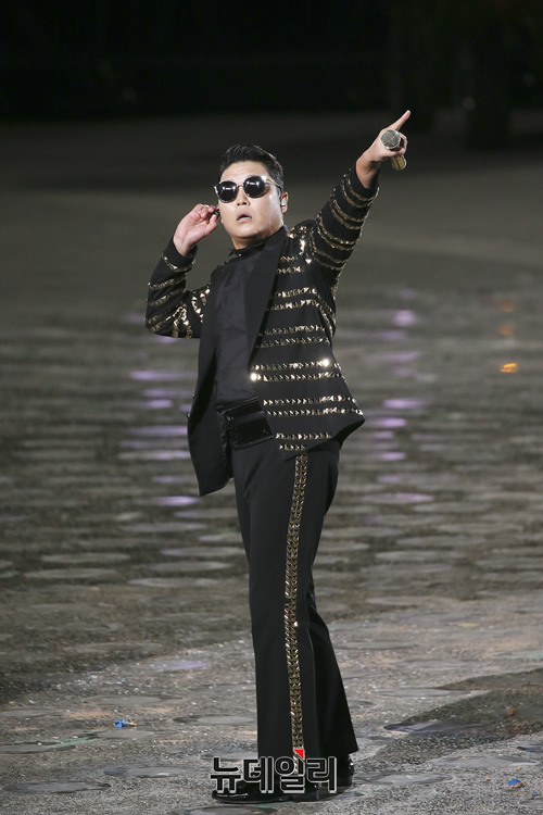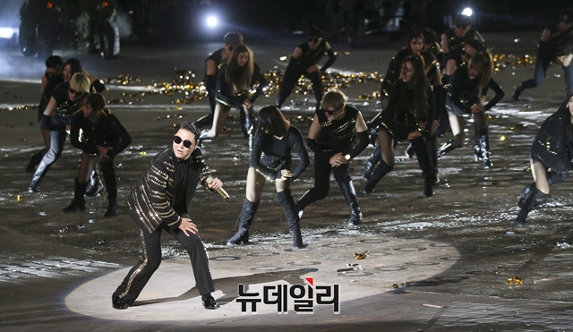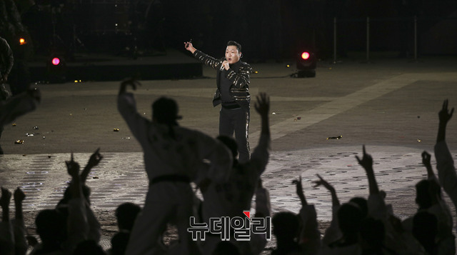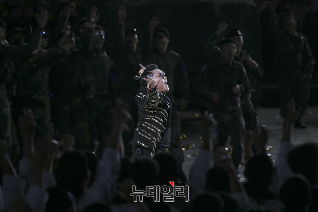 가수 싸이가 1일 오후 서울 용산구 전쟁기념관에서 열린 제70주년 국군의 날 기념식에서 축하 무대를 선보이고 있다.(사진=공동취재단)
