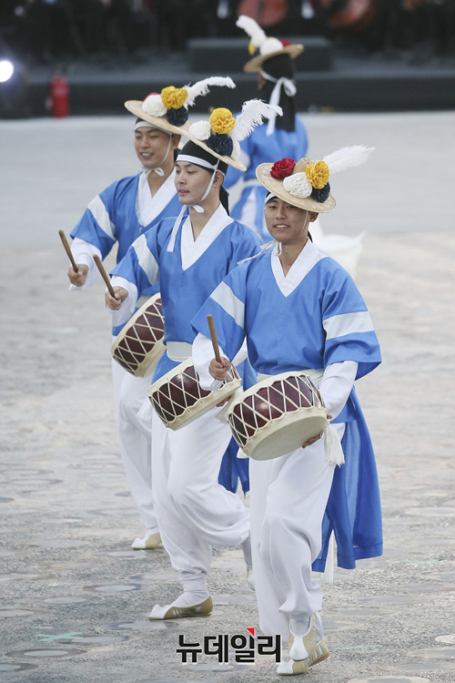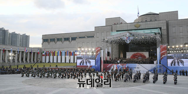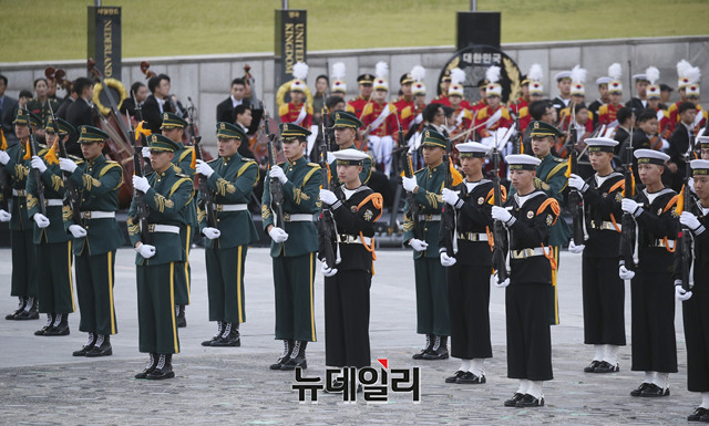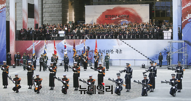 제70주년 국군의날 기념식이 1일 오후 서울 용산구 전쟁기념관에서 열린 가운데 의장대가 축하공연을 하고 있다. (사진=공동취재단)