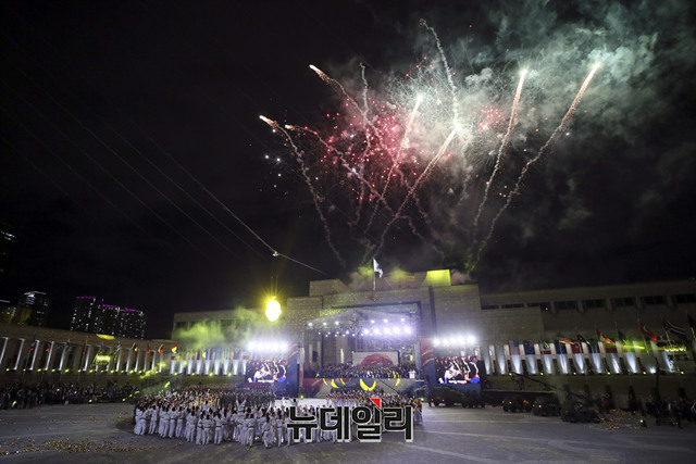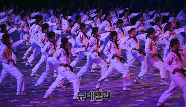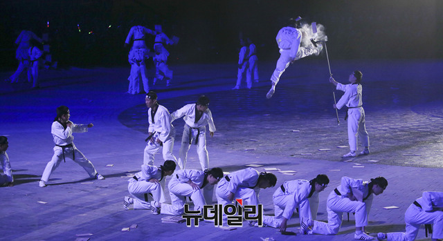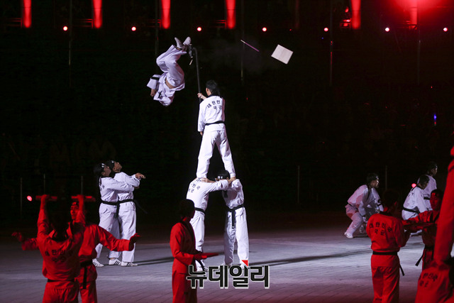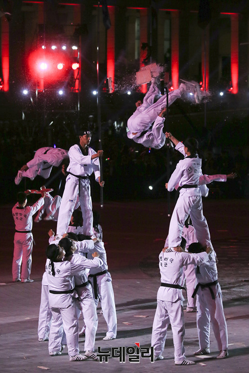 우리군이 1일 오후 서울 용산구 전쟁기념관에서 열린 제70주년 국군의 날 기념식에서 태권도 격파 시범을 보이고 있다. (사진=공동취재단)