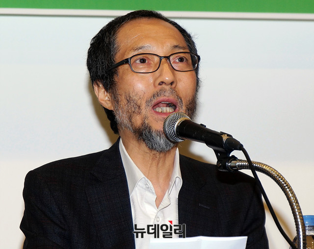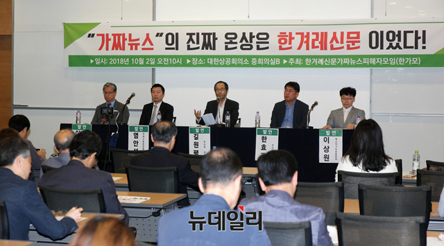 길원평 부산대학교 교수가 2일 오전 서울 중구 대한상공회의소에서 열린 '가짜뉴스의 진짜 온상은 한겨레신문' 기자회견에 참석해 발언을 하고 있다.