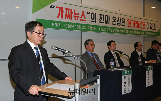 제양규 한동대학교 교수가 2일 오전 서울 중구 대한상공회의소에서 열린 '가짜뉴스의 진짜 온상은 한겨레신문' 기자회견에 참석해 성명서를 낭독하고 있다.이날 제 교수는 성명서를 통해 "한겨레신문이 지목한 가짜뉴스의 대부분은 가짜가 아니라 사실로 밝혀졌다"며 "한겨레신문이 오히려 가짜뉴스의 진짜 온상임이 밝혀졌다"고 말했다.앞서 한겨레신문은 지난 9월 27일 '동성애·난민혐오 '가짜뉴스 공장'의 이름, 에스더'라는 제목의 기사를 지면 1면에 개제한 바 있다.