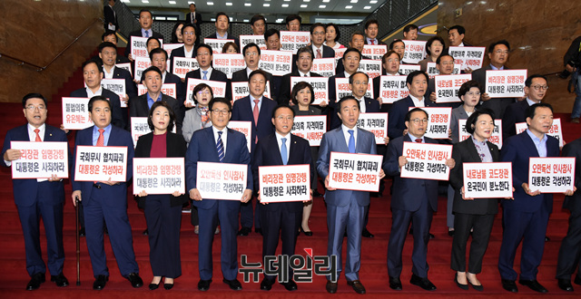 김성태 자유한국당 원내대표 등 의원들이 2일 오후 국회 본관 중앙계단에서 긴급 의원총회를 열고 문재인 대통령의 유은혜 사회부총리 겸 교육부 장관 임명을 규탄하는 구호를 외치고 있다.