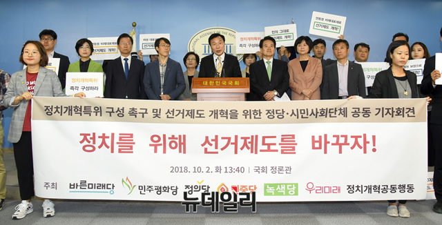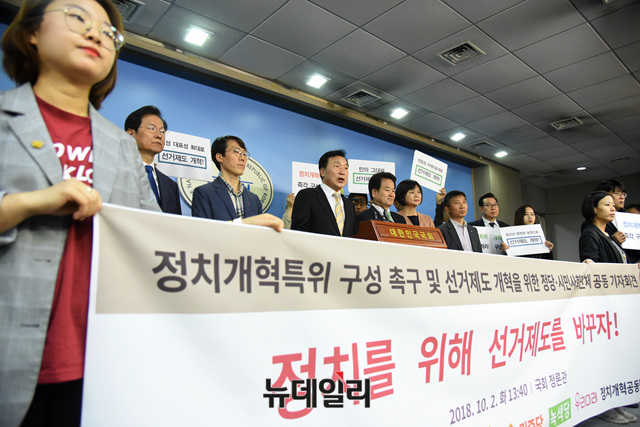 손학규 바른미래당, 정동영 민주평화당, 이정미 정의당 대표가 2일 오후 국회 정론관에서 열린 정치개혁특위 구성 촉구 및 연내 선거제도 개혁 결의 정당·시민사회 공동기자회견에 참석했다.