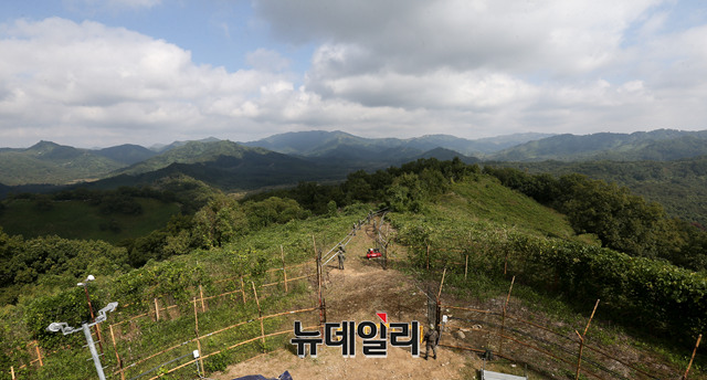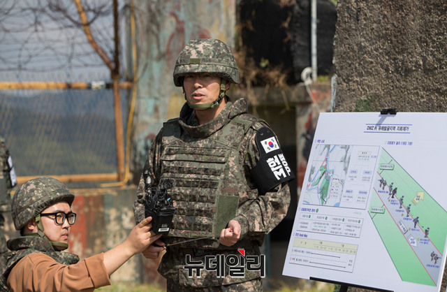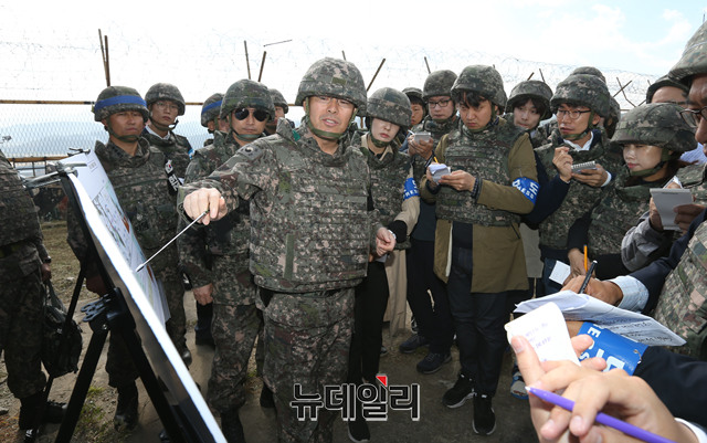 2일 오전, 강원도 철원 화살머리고지 일대 GP 앞에서 현지부대 지휘관이 취재진 앞에서 DMZ 내 유해발굴 지역 지뢰제거 작전 브리핑을 마치고 질의응답을 하고 있다. (사진=공동취재단)