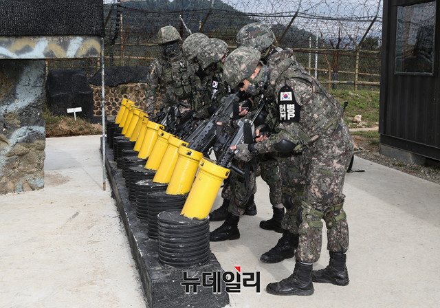 강원도 철원 화살머리고지 일대 GP 앞에서 현지부대 및 123공병 지뢰제거팀이 2일 오전 DMZ 내 유해발굴을 위한 지뢰제거 작전을 수행하고 있다. (사진=공동취재단)