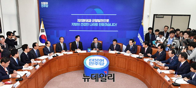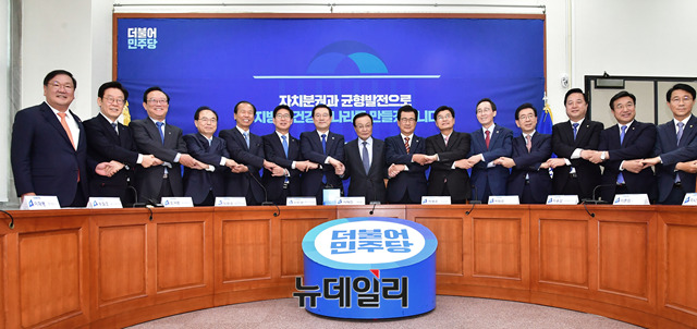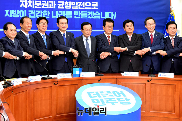 이해찬 더불어민주당 대표와 시도지사들이 11일 오전 국회 당대표실에서 열린 당대표 시도지사 간담회에서 기념촬영하고 있다. (왼쪽부터 김태년 정책위의장, 이재명 경기도지사, 송철호 울산시장, 오거돈 부산시장, 최문순 강원도지사, 양승조 충남도지사, 이용섭 광주시장, 이해찬 대표, 이시종 충북도지사, 이춘희 세종시장, 송하진 전북지사, 박원순 서울시장, 김두관 의원, 윤호중 사무총장, 조정식 예결위 간사, 김성환 의원)