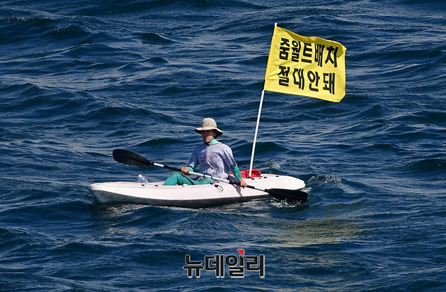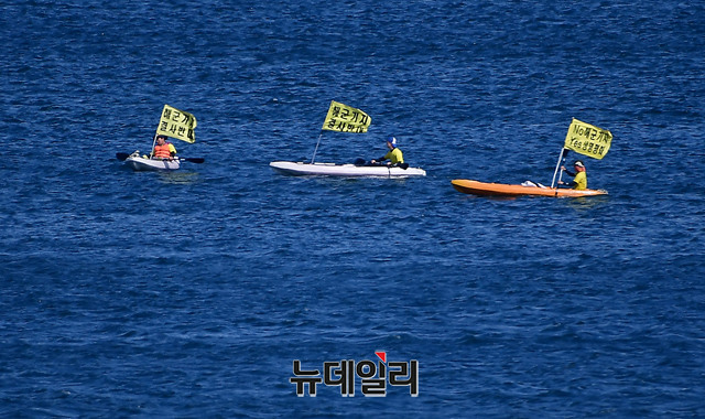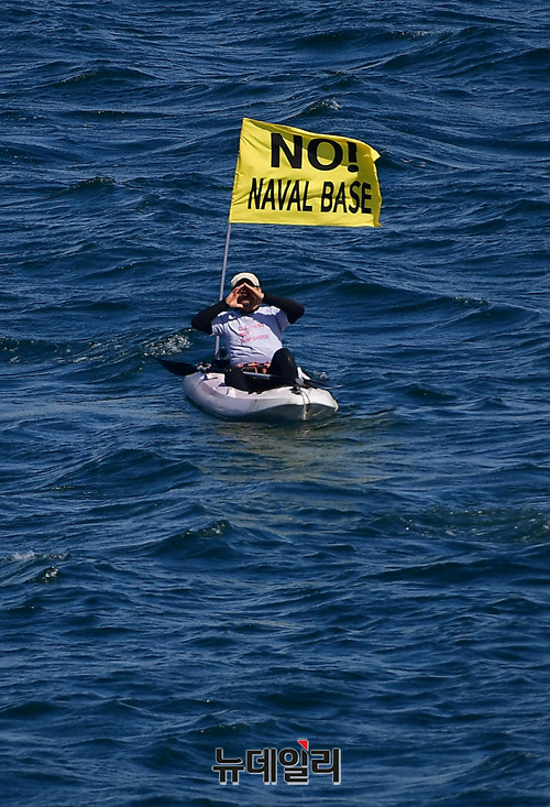 국제관함식이 열리고 있는 11일 오후 제주 남방해역에서 국제관함식을 반대하는 좌파단체가 카약을 타고 해상시위를 하고 있다.국내 함정 사열에는 율곡이이함(DDG, 7,600톤)을 시작으로 함형별 크기 순으로 이뤄졌다. 외국함 사열은 총 16척이 국가별 알파벳 순서로 사열에 나섰다. 미국 로널드레이건 항공모함을 함정 크기상 가장 후미에 위치해 사열에 참가했다.일본 해상자위대 함정은 해상자위대기 게양의 이유로 불참했다. 중국은 해군 대표단은 참가했지만 참가 예정이던 정저우함은 불참 했다. (제주=뉴데일리 정상윤 기자)