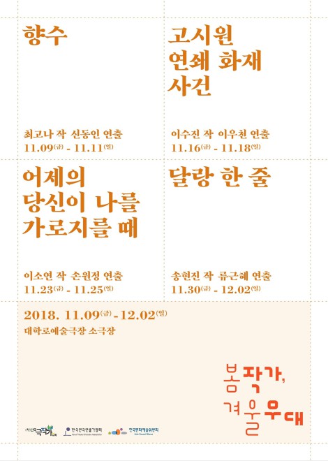 한국문화예술위원회(이하 예술위)와 한국극작가협회, 한국연극연출가협회가 공동 주최하는 '봄 작가, 겨울 무대' 공연이 11월 9일부터 12월 2일까지 대학로예술극장 소극장에서 열린다.