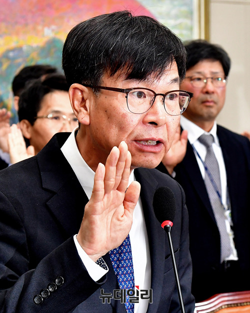 김상조 공정거래위원장이 15일 오전 국회에서 열린 정무위원회 국정감사 출석해 증인선서를 하고 있다.