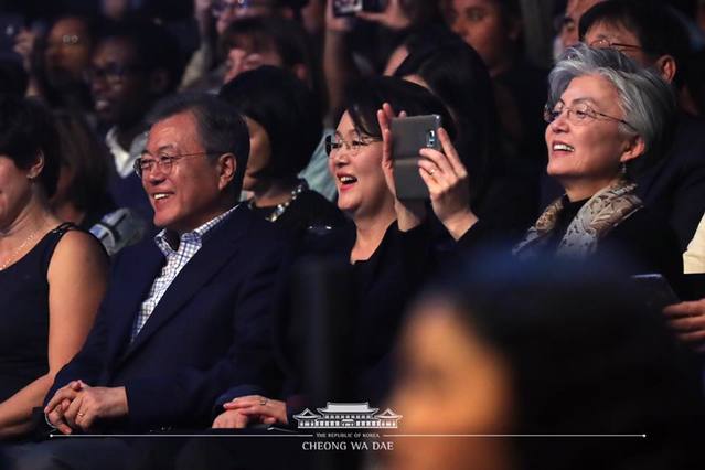 이날 강경화 외교부 장관, 유영민 과학기술정통부 장관, 성윤모 산업통상자원부 장관, 정의용 국가안보실장, 최종문 프랑스대사 내외, 록사나 마라시노뉘 프랑스 체육부 장관, 자크 랑 프랑스 하원의원, 스테판 이스라엘 '아리안스페이스' 최고경영자, 파비앙 페논 주한프랑스대사 등이 동석한 가운데 극장 2층에 앉아 공연을 관람한 문 대통령은 공연 말미, 큰 환호성과 함께 방탄소년단이 등장하자 허리를 앞으로 바짝 당기며 집중하는 모습을 보였다.