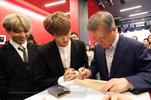 방탄소년단 멤버들은 유엔 총회 당시 선물로 받았던 문 대통령의 서명 시계(이니시계)를 고스란히 들고 와 상자에 사인을 받았다.