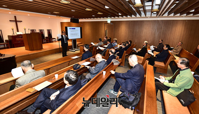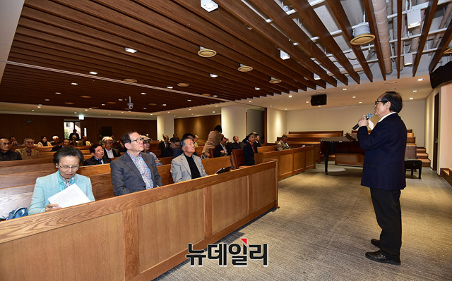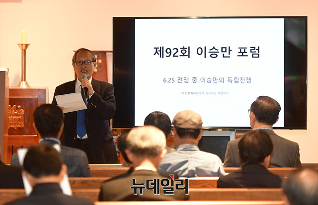 인보길 이승만포럼 공동대표가 16일 오후 서울 중구 정동제일교회 아펜젤러 홀에서 열린 제92회 이승만포럼에서 '6.25전쟁 중 이승만의 독립전쟁'을 주제로 강의하고 있다.