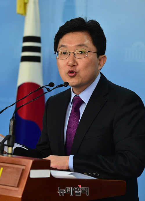 김용태 자유한국당 사무총장이 16일 오전 국회 정론관에서 기자회견을 갖고 있다. 이날 김 사무총장은 "서울시 산하기관인 서울교통공사 임직원들의 친인척들이 대거 채용 및 정규직전환 되었다"며 이는 "문재인-박원순-민주노총 권력형 채용비리 게이트"라고 주장했다.