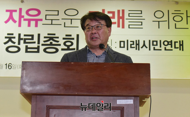 우파 시민단체인 '공정하고 자유로운 미래를 위한 시민연대(미래시민연대)' 창립대회가 16일 오후 국회 의원회관에서 열린 가운데 조전혁 전 의원이 인사말을 하고 있다.