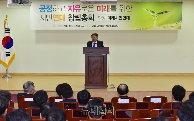 우파 시민단체인 '공정하고 자유로운 미래를 위한 시민연대(미래시민연대)' 창립대회가 16일 오후 국회 의원회관에서 열린 가운데 정규재 펜앤드마이크 대표이사가 기조강연을 하고 있다.