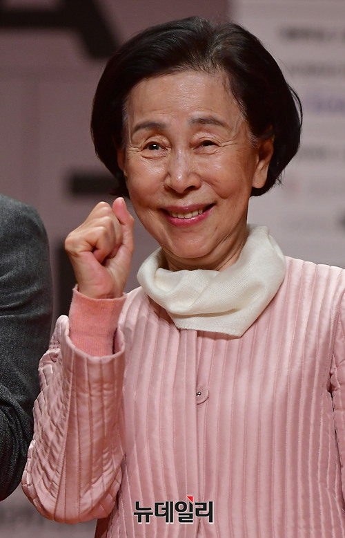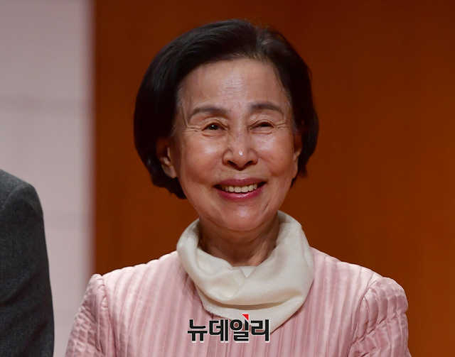 손숙 아시아나국제단편영화제 이사장이 17일 오전 서울 종로구 금호아트홀에서 열린 기자간담회에서 기념촬영을 하고 있다.