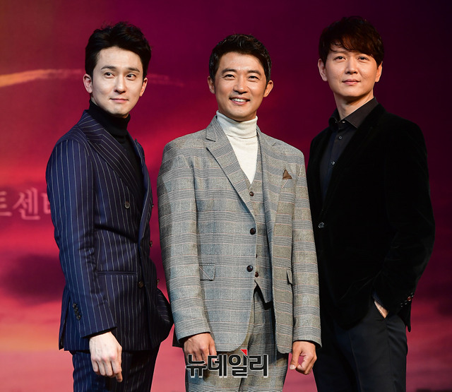 배우 강필석, 안재욱, 이건명(왼쪽부터)이 17일 오후 서울 중구 더프라자호텔에서 열린 창작뮤지컬 '광화문연가' 제작발표회에서 포토타임을 갖고 있다. 이들은 중년 명우 역을 맡았다.