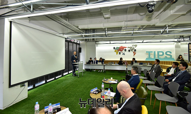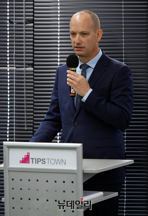 '나다브 펠드만(Nadav Peldman)' 주한이스라엘대사관 부대사가 18일 오후 서울 강남구 팁스타운에서 열린 '제1회 스타트 예루살렘 2018(Start Jerusalem 2018)' 한국대회에서 인사말을 하고 있다.