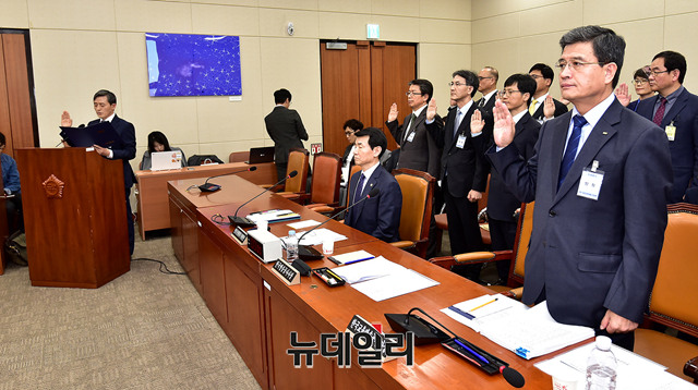 장해랑 한국교육방송공사 사장이 19일 오전 국회에서 열린 국회 과학기술정보방송통신위원회의 한국방송공사(KBS)와 한국교육방송공사(EBS)에 대한 국정감사에서 증인선서를 하고 있다.