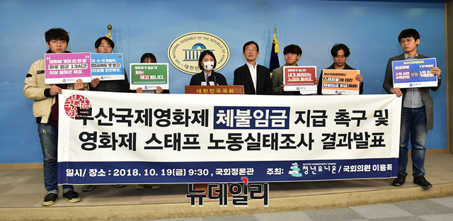 부산국제영화제 스태프들이 19일 오전 국회 정론관에서 체불임금 지급과 관련해 기자회견을 갖고 있다.