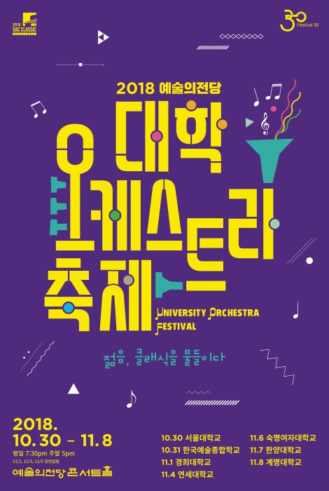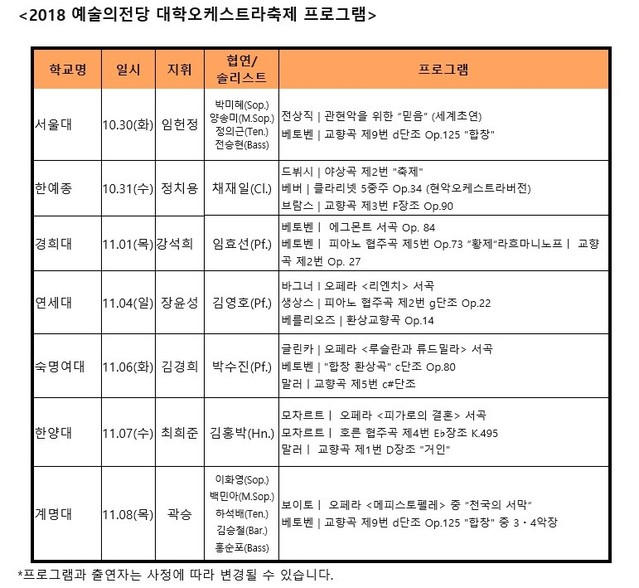대학생들의 클래식 열정이 예술의전당을 물들인다.예술의전당(사장 고학찬)은 10월 30일부터 11월 8일까지 '대학오케스트라축제'를 콘서트홀 무대에서 총 7회 선보인다.2013년 시작해 5회를 맞이하는 '2018 예술의전당 대학오케스트라축제'는 국내를 대표하는 음악대학 오케스트라를 한 자리에서 만나볼 수 있는 유일한 자리다.