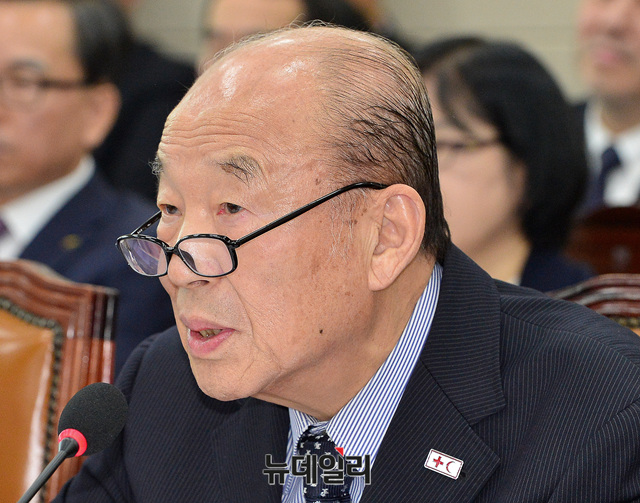 박경서 대한적십자사 회장이 22일 오전 국회에서 열린 보건복지위원회 국정감사에 출석해 질문에 답하고 있다.