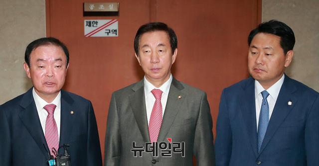 김성태 자유한국당, 김관영 바른미래당, 장병완 민주평화당 원내대표가 22일 오전 국회 정론관에서 서울교통공사의 고용세습 등 채용비리 의혹과 관련해 '공공기관 채용비리·고용세습 의혹 진상규명을 위한 국정조사 요구' 기자회견을 하고 있다.
