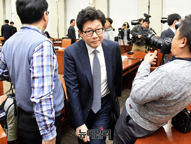 조명래 환경부 장관 후보자가 23일 오전 국회에서 열린 환경노동위원회의 인사청문회에서 정회 후 회의실을 나서고 있다. 이날 인사청문회는 조 후보자의 자료 제출 미비를 이유로 여야 공방이 오갔다.