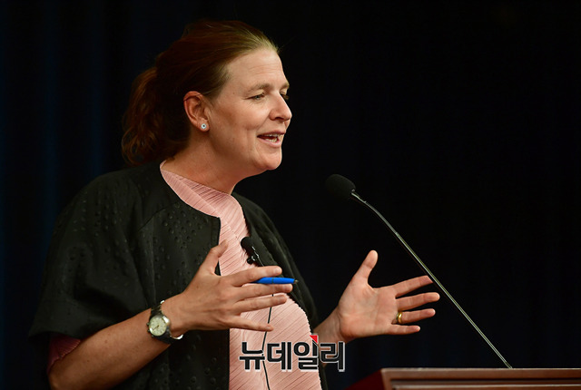 엘레노어 칸텔 주한스웨덴대사관 부대사가 24일 오후 서울 여의도 국회 헌정기념관에서 열린 '2018 국제납세자권리 컨퍼런스'에서 축사를 하고 있다.