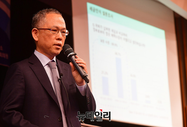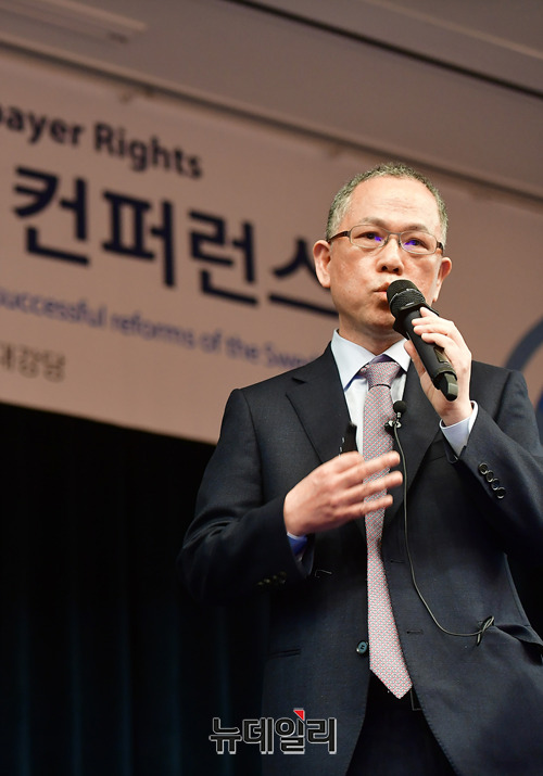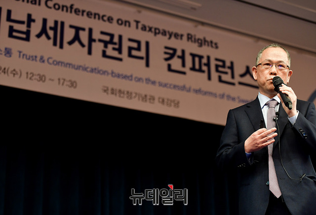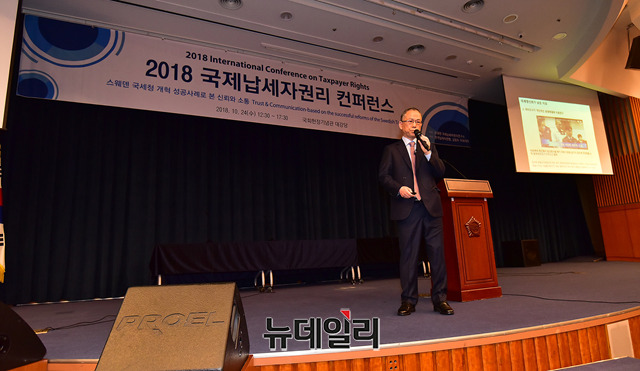 김선택 한국납세자연맹 회장이 24일 오후 서울 여의도 국회 헌정기념관에서 열린 '2018 국제납세자권리 컨퍼런스'에서 '한국 국세청의 신뢰가 낮은 원인과 개선방안'을 주제로 강연하고 있다.