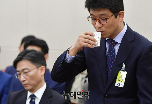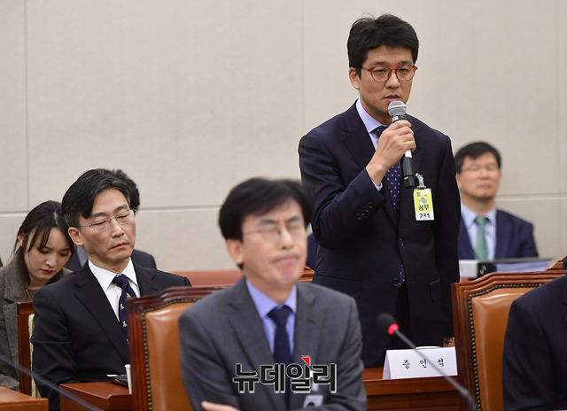 정상봉 국립중앙의료원 신경외과장이 24일 국회에서 열린 국회 보건복지위원회의 한국보건의료인국가시험원 등에 대한 국정감사에 증인으로 출석해 의원들의 질의를 받고 있다. 정 신경외과장은 의료기기 업체 직원의 대리 수술 집도 의혹을 받고 있다.