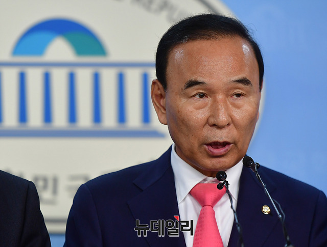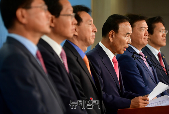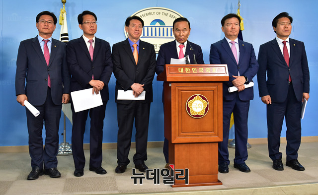 국회 국토교통위원회 소속 자유한국당 의원들이 25일 오전 국회 정론관에서 국토교통위원회 국정감사 '경의선 남북 철도·도로 연결구간 현장시찰 불참과 관련해 기자회견을 갖고 있다.