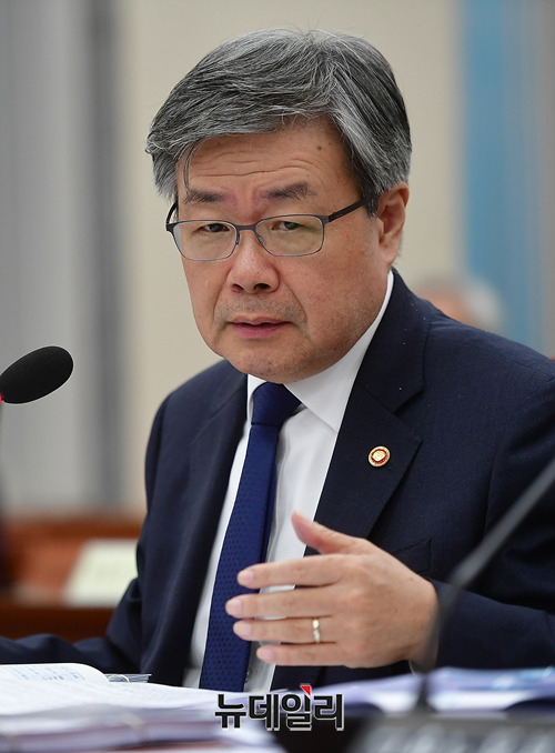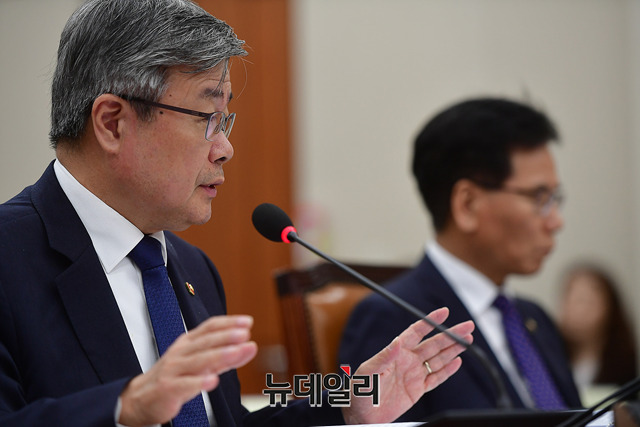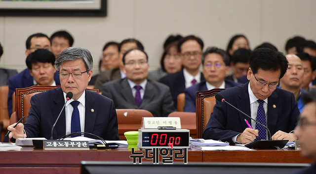 이재갑 고용노동부 장관이 26일 오후 국회에서 열린 국회 환경노동위원회의 고용노동부에 대한 국정감사에 참석해 질의에 답하고 있다.