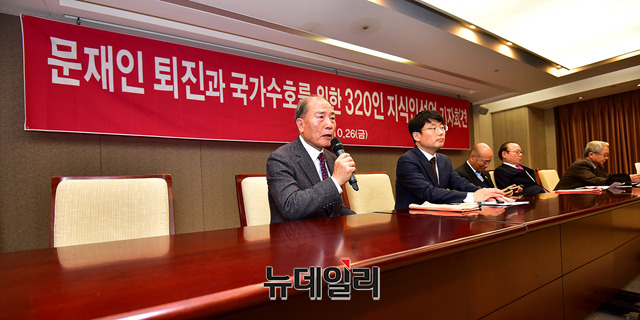 이계성 대한민국수호천주교모임대표가 26일 오전 서울 중구 한국프레스 센터에서 열린 '문재인 퇴진과 국가수호를 위한 320인 지식인선언' 기자회견에서 발언을 하고 있다.이들은 문재인 정부에 △남북군사합의서의 무효 △국방태세 약화 조치에 대한 원상복귀 △대북제재 국제공조 동참 △종전선언 연내 추진 중단 △특별재판부 설치 철회 △드루킹, 북한석탄, 고용세습 진상규명 △탈원전 정책 중단 △방송장악 중단 △최저임금 고시안 철회 △반기업 정책 중지 △대통령 퇴진 등을 요구했다.