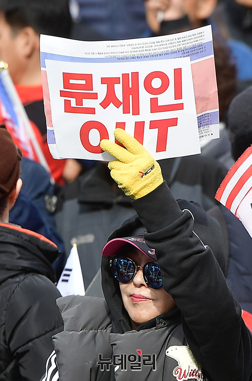 문재인정권 퇴진 국민 총궐기 참석자가 27일 오후 서울 중구 대한문 앞에서 열린 집회에서 '문재인OUT'라고 적힌 손피켓을 들고 있다.