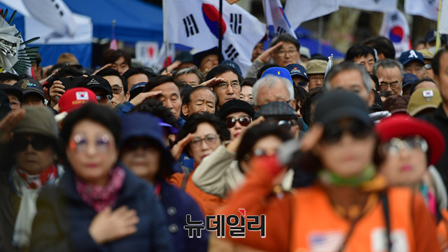 문재인정권 퇴진 국민총궐기 참가자들이 27일 오후 서울 중구 대한문 앞에서 태극기와 성조기를 흔들며 구호를 외치고 있다.