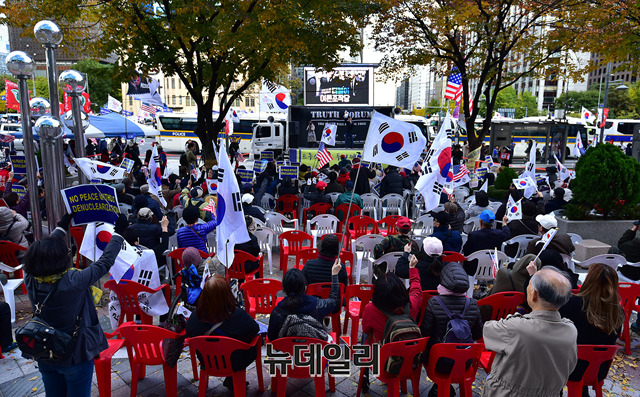 트루스포럼이 27일 오후 서울 종로구 동화면세점 앞에서 2번째 거리집회를 갖고 있다. 이날 대한문 앞에서는 태극기혁명국민운동본부가 주도한 문재인정권퇴진 국민총궐기가 열려 문재인 정권의 △국가해체 △국군무력화 △법치파괴 △언론탄압 △한미동맹 파괴시도를 규탄하며 퇴진을 촉구했다.