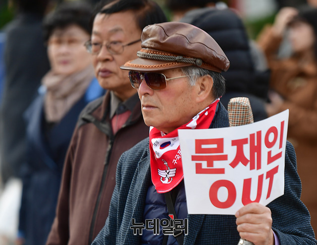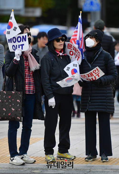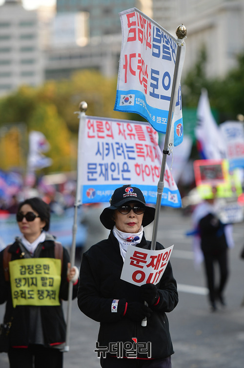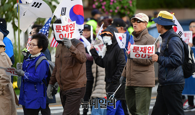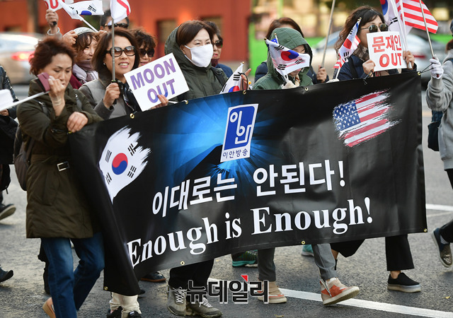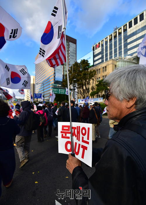 문재인정권 퇴진 국민총궐기의 참가자들이 27일 오후 서울 중구 대한문에서 열린 집회 직후 문재인 퇴진을 촉구하는 손피켓을 들고 청와대 방향으로 가두행진을 이어가고 있다.