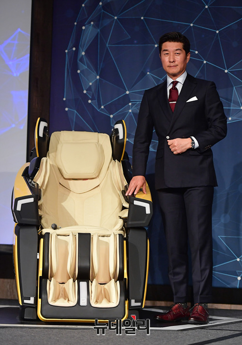 배우 김상중이 30일 오전 서울 종로구 포시즌호텔에서 열린 바디프랜드 브레인 마사지 발표회에 참석해 제품을 시연하고 있다.