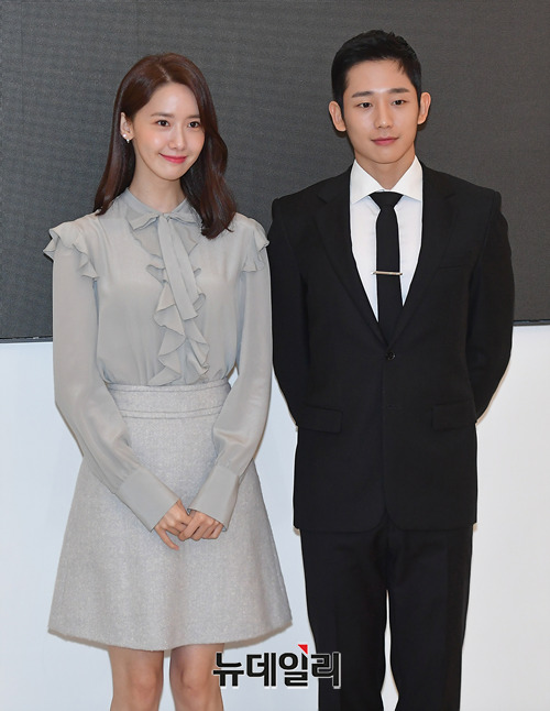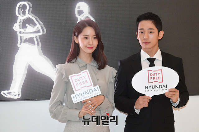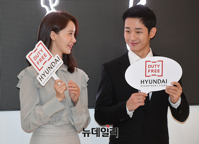 배우 정해인과 가수 윤아가 1일 오전 서울 강남구 현대백화점면세점 무역센터점에서 열린 그랜드 오픈 기념행사에 참석해 포토타임을 갖고 있다. 이날 행사는 10층 미디어월에 전시된 '줄리안 오피'의 '워킹피플' 작품을 배경으로 진행됐다. 정해인과 윤아는 현대백화점면세점의 광고모델로 활동 중이다.