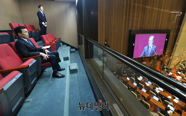 [포토] 文 대통령 시정연설 지켜보는 손학규 바른미래당 대표